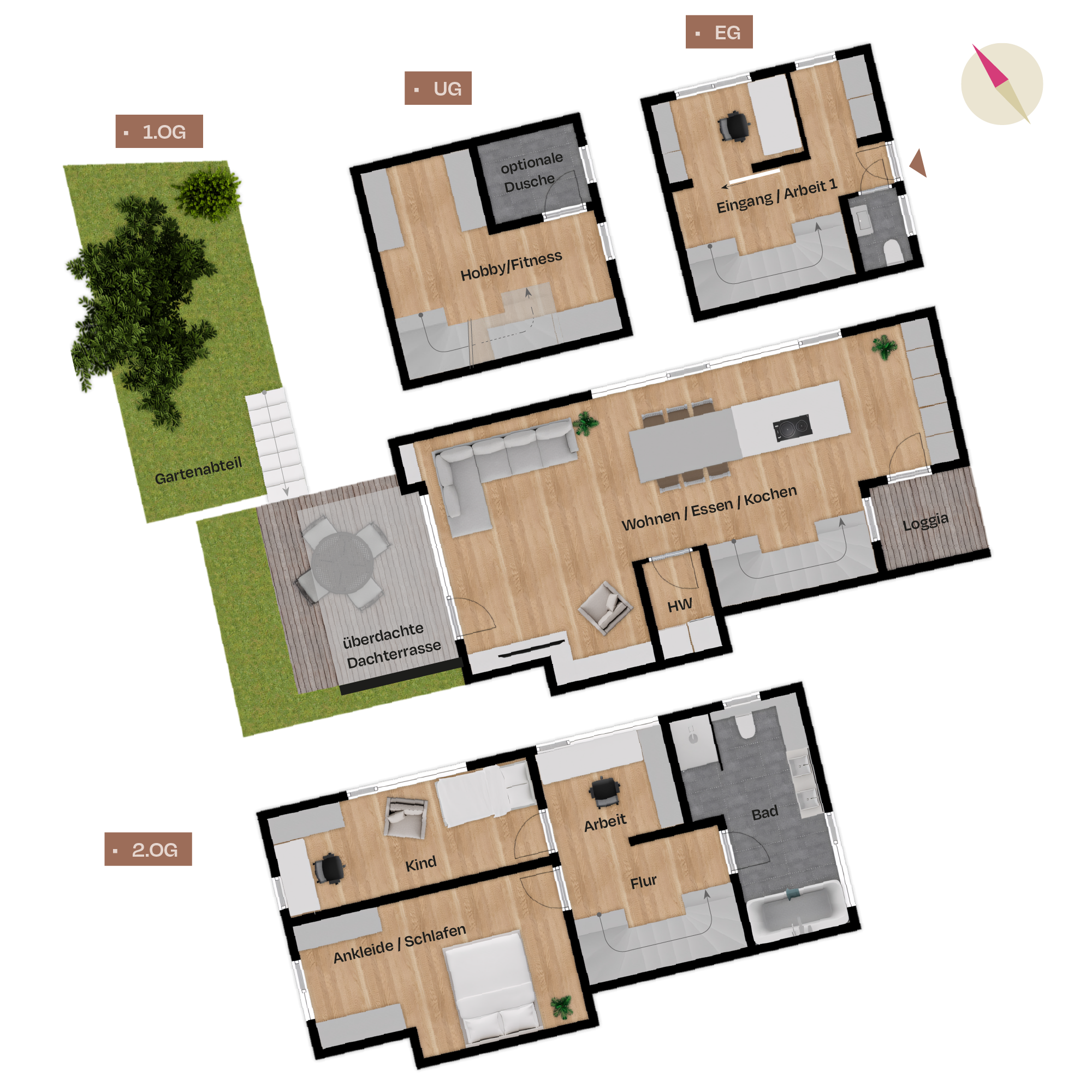- Flexibles Untergeschoss: Finden Sie Platz für einen Fitness-/Hobbyraum (Ausbau in Wohnraumqualität) mit 2,50 m Deckenhöhe und Belichtung durch Lichtschächte (nicht in der Wohnflächenberechnung enthalten)